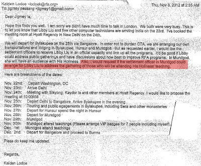嘎登洛卓到底要求得到什么样的机会?让这位刘女士在达赖喇嘛的传法会上走上讲台发表讲话?我从未听说过比这更加不敬,甚至是亵渎的事情。我们还可以从行程安排中看到司炯也将在24日与刘仚在德里的凯悦丽晶酒店(Hyatt Regency)会晤。他究竟需要和这位女士会晤多少次?有什么事情如此紧迫?