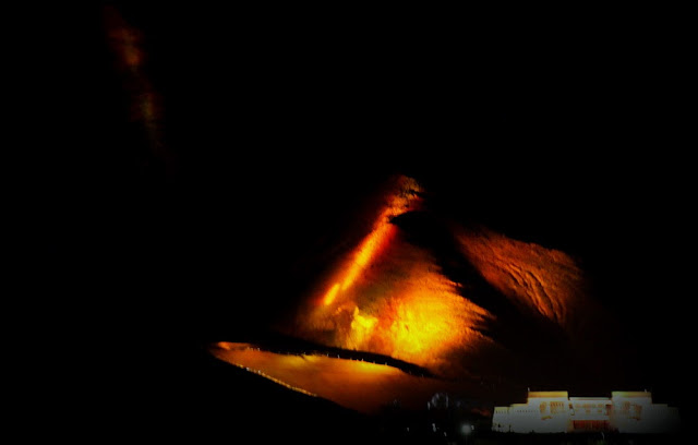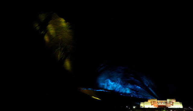 专为此剧而建的剧场位于拉萨东边的朋巴日(宝瓶山)一侧,隔着拉萨河,与饱含沧桑的布达拉宫遥遥相对,完全是仿造布达拉宫的赝品出炉,无论是在自然的阳光下还是人为的灯光下,立即映衬出那类似地摊上摆着卖的假古董的本质,除非是在深夜浓重的黑暗中才得以掩藏。