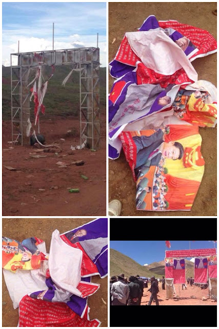 8月16日,执行镇压抗议开矿藏人任务的军警,在阿多乡将挂有习近平关于环境保护的讲话及照片撕碎并扔在地上。