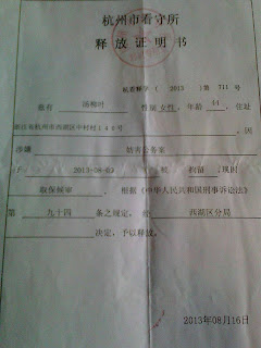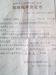 8月9日上午,汤柳叶带发烧的7岁儿子去省人民医院看病,又被便衣警察绑架走。晚上警察将汤柳叶7岁的儿子送回家, 告诉汤柳叶家人说,汤柳叶在北京扰乱公共秩序要关十几天。当天晚上,警察强行提审汤柳叶,次日凌晨1点多,她被以妨害公务罪送到杭州看守所刑拘。8月17日凌晨3点,汤柳叶回家,但也被取保候审一年。