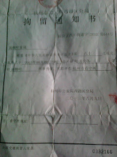 (维权网信息员蓝天蔚报道)8月8日凌晨5点左右,杭州市西湖区警察姚永生带了—批黑保安冲进转塘镇大渚桥村杨云彪家,来抓捕杨云彪,杨一看情况不妙,就跑进厨房,拿起菜刀架在自己的脖子上,以死抵抗,这时一个叫杨勇的警察来阻止他,杨云彪不小心划伤了他的手。僵持了一段时间后,警察接到电话就撤离了他家。杨云彪连夜离开了家里,到了萧山。第二天清晨,他跟邵江金一起出去吃早餐的时候被抓。抓走之后杨云彪被直接送到西湖区刑警大队,到晚上10点多,以“妨害公务罪”将其刑事拘留,把他押送到西湖区看守所。8月16日晚上11点多,杨云彪解除刑拘,但被“取保候审”一年。