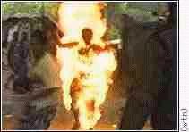 我相信欧珠早已决定就义牺牲,对他来说引火自焚是绝食至死的加速形式。它是最後的,绝望的姿态,一位无能为力,以为别无选择,声音未曾被听见的人的呐喊。我曾在达卡的难民营见过滞留的巴基斯坦人和印度比哈尔人的难民有过相似情况,这些难民曾考虑通过自焚以让世人关注他们面对的绝境。