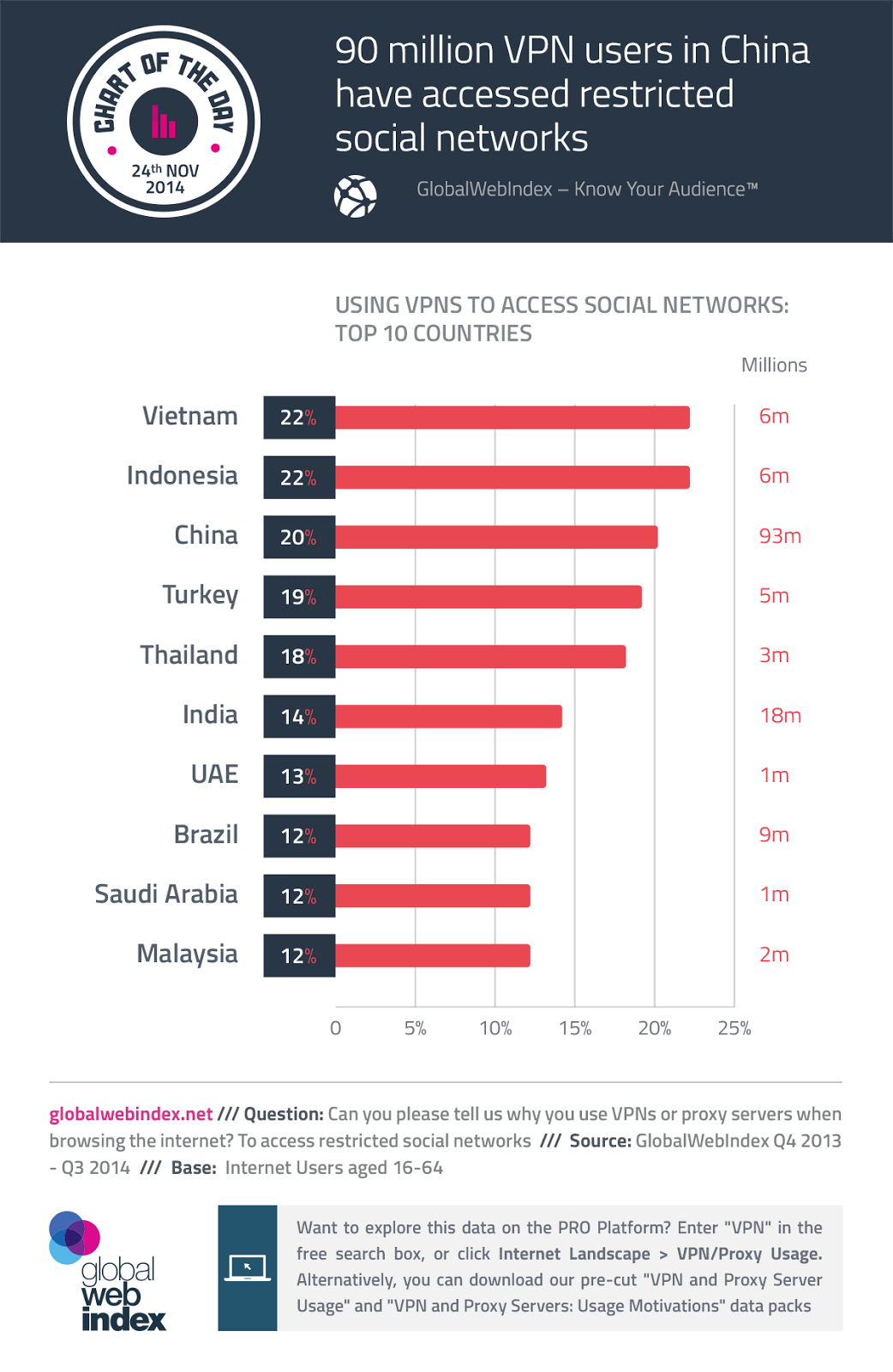 市场研究公司Globalwebindex在2014年Q3的GWI Social报告(需要付费)中特别观察了利用VPN和代理服务器访问受限社交网络的趋势,但由于调查样本(超过4万)的规模和被动检测的限制,结果可能存在巨大的误差。报告声称,中国有9300万VPN网民,这个数字可能是过高估计了。报告称,印度尼西亚和越南有22%的网民——相当于600万——使用VPN访问社交网络,而中国是20%——相当于9300万,远远超过美国和英国。