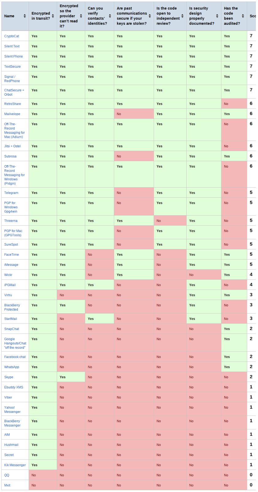 非盈利新闻组织 ProPublica 发布了「最好的安全通信工具」排名,39个工具中,CryptoCat 综合评分位居榜首,中国产软件 QQ 排名倒数第二。http://t.co/te0z72eQgl via @propublica pic.twitter.com/WSWJOh1whR
