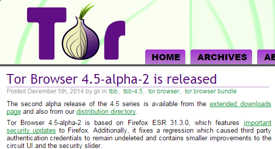 Tor Browser 4.5-alpha-2 is based on Firefox ESR 31.3.0, which features important security updates to Firefox. Additionally, it fixes a regression which caused third party authentication credentials to remain undeleted and contains smaller improvements to the circuit UI and the security slider.