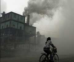 [Image:A cyclist passes through thick pollution from a factory in Yutian, 100km east of Beijing last month, from Channelnewsasia.com]