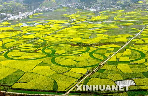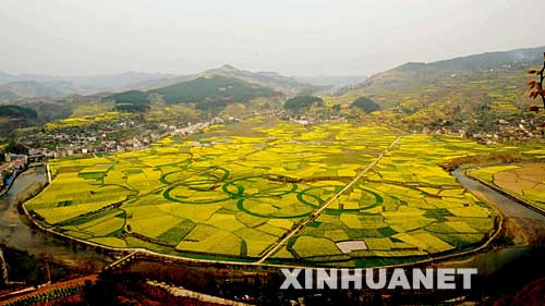 Peasants in Kaiyang County, Guizhou province grew a pattern of Olympic Rings in their rapeseed and wheat fields. The diameter of each ring is 136 meters.