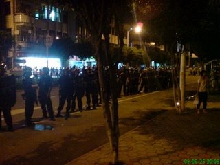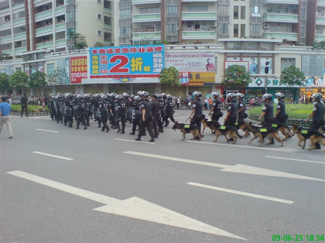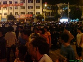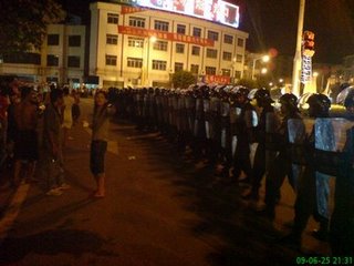 Here are some photos currently spreading in Chinese blogosphere and BBS. The photos were taken yesterday, at Gangkou Town, Zhongshan City, Guangdong province (广东省中山市港口镇). According to Civic Life Watch (民生观察) on 2009-6-26 : “We could not reach police in Gangkou last night. This morning, Gangkou police bureau answered their call and told the caller that police are handling the situation and local government may publicize relevant information.” No further details on the incident or its cause are immediately available.