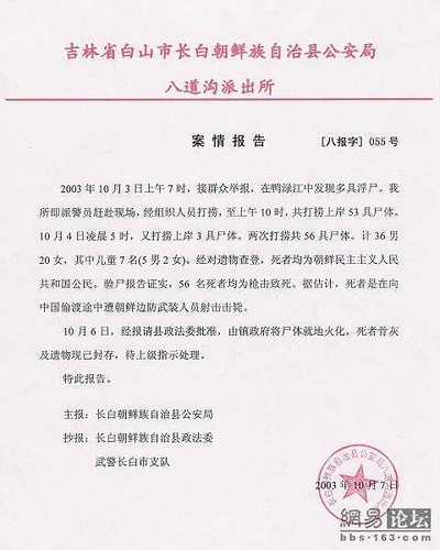 Translation of the document: “PRC blog carried without comment a photo, apparently reposted from bbs.163.com, of an October 2003 Jilin Province, Baishan City, Changbai Korean Nationality Autonomous County Public Security police station report of bodies found floating in the Yalu River. All apparently DPRK citizens: 36 men, 20 women, 7 children. According to the medical examiner’s report, all had been shot to death. According to the report, It is supposed that they were all were shot by DPRK border guards as they attempted to sneak across the DPRK – PRC border. The bodies were cremated, and the ashes stored pending instructions from higher authority. ”