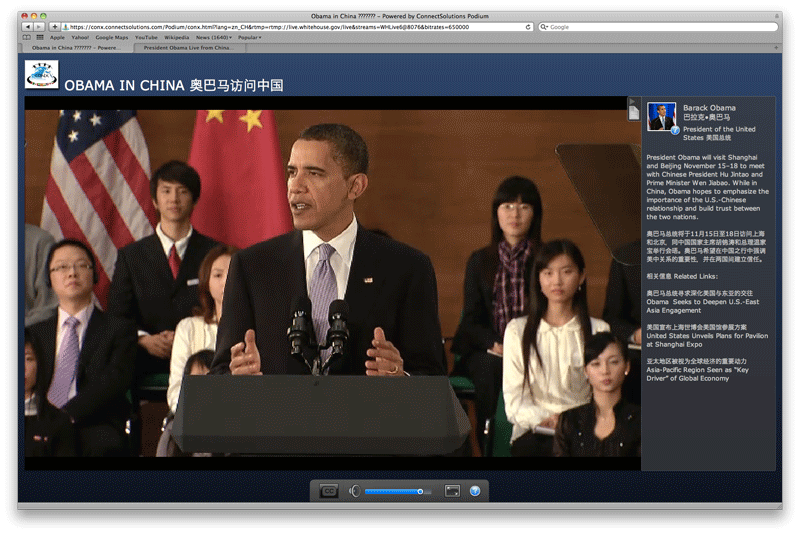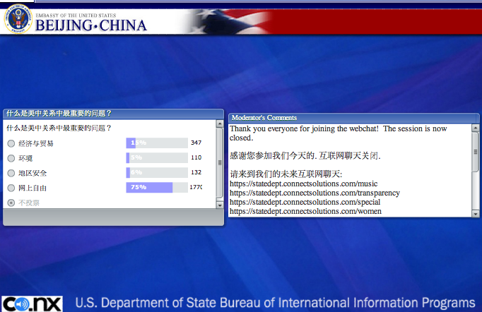 On Friday, the Co.Nx team at the State Department opened up an Adobe Acrobat Connect Pro chat room on our QuickConnect Platform where Chinese citizens were encouraged to submit questions for President Obama and share their biggest concerns. What was most clearly articulated in the chat room was an apprehension over the censorship of the internet in China, and a growing movement was revealed. In fact, over 75% of respondents in the chat room cited internet censorship as their greatest concern. They dubbed this the “Great Firewall of China” and they aligned themselves with the 20th Anniversary of the Berlin Wall coming down, speaking out against what they perceived to be widespread government censorship of the internet.