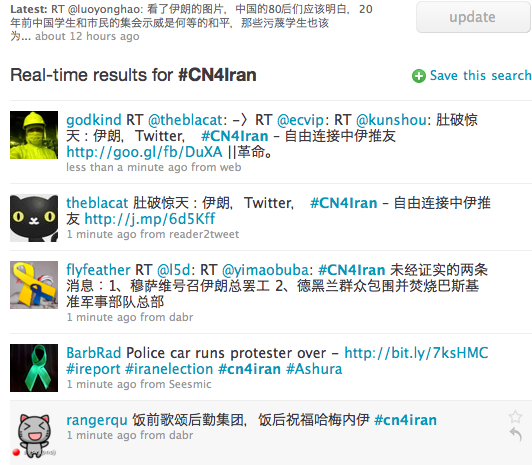 CN4Iran included a self-congratulatory post: “#cniran is a trending topic to your right. That’s despite twitter being banned in China. Very nice.”