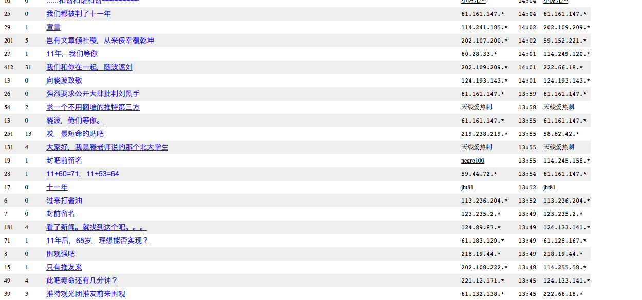 The Chinese Communist Party’s Central Propaganda Department has issued an order to all Chinese search engines to block search results for the term “11 years.” But some netizens have just opened a Baidu forum under the keyword “11 years” here. Almost all comments are in support of Liu Xiaobo.