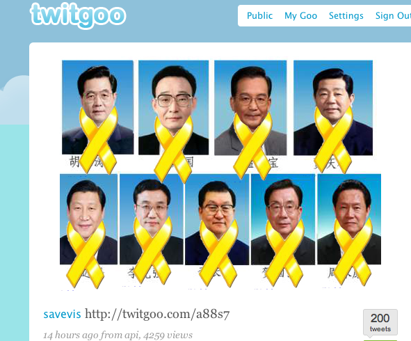 Updates: On Twitter, thousands of Twitterers put yellow ribbons on their profiles to show support for Liu Xiaobo. CDT translated a few tweets as examples: