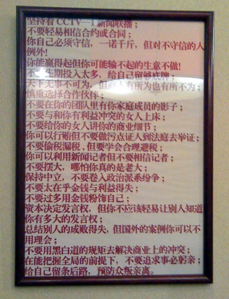 The following document was reportedly found on the wall of a Zhejiang businessman’s office, and has since been circulated widely among Chinese bloggers.
