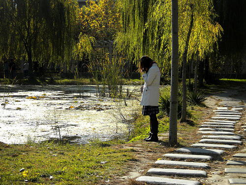 A woman deep in thought next to a pond, by Jeremy Barwick