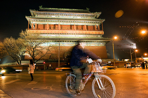Bicycling at night in front of the Drum Tower, Beijing, by Subu-yan