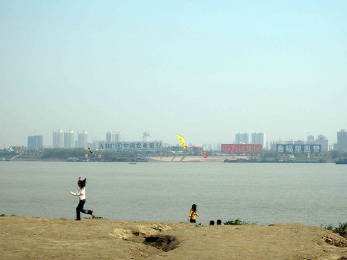 Flying kites along the Yangtze River in Wuhan, by jijis