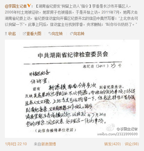 @Journalist Li Guosheng: Hunan Provincial Discipline and Inspection Commission Order to Detain Petitioner: Li Xiang is from Kaifu District in Changsha. In 2006, her village land was reclaimed and her house was demolished. She then began to petition. In July of 2011, she once again petitioned the Hunan Provincial Discipline and Inspection Commission. Shockingly, the provincial Discipline and Inspection Commission’s petitioning office sent the following letter to the Kaifu District Discipline and Inspection Commission: “If she goes to Beijing to petition, you may detain her.” After this news got on the web, the head of the petitioning office found Li Xiang and implored her to delete the post, saying, “I’m begging you.”1