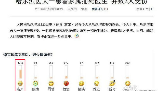 Minter also calls attention to a now-deleted survey posted by The People’s Daily, in which an overwhelming 65% of the more than 6,000 respondents indicated a happy reaction to Wang Hao’s murder (screen shot below, via Bloomberg). Another survey, taken after Wang Hao’s murder and published by The Global Times on Wednesday, showed that nearly 63% of respondents have a negative impression of Chinese medical staff.