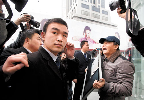 A man outside Shanghai’s Middle Huaihai Road store attracted the attention of 10 police officers when he threatened to smash what he claimed was a defective 27-inch iMac that he had purchased, according to China Daily (which published the above photo):