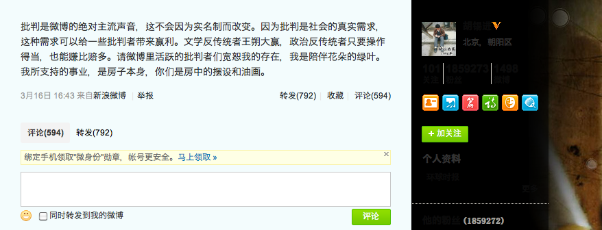 The dominant voice of Weibo is that of critique. Real name registration will not change this. Since critique is society’s true demand, this demand can bring profit to a few critics. Cultural iconoclast Wang Shuo has benefited enormously from this. Political iconoclasts need only handle Weibo appropriately to turn a profit. Active Weibo critics, please forgive my presence. I am the leaf accompanying the flower. The cause I support is the house itself, while you are the decoration and paintings inside.