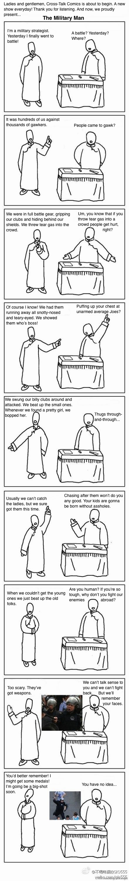 Weibo user gio555 reimagines the crackdown on Shifang protesters as a comedy sketch. Cross-talk, often likened to Abbott and Costello’s “Who’s on First” routine, employs rapid-fire punning and wisecracking. The best cross-talkers add social commentary to their verbal gymnastics. The two “actors” in gio555’s comic wear traditional men’s robes. A kerchief, wooden “awakening” block and fan lay on the table, neglected in the heat of the argument. Read the original here.