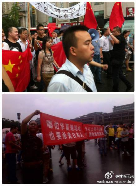 corndog: This photo is from an anti-Japanese protest in Western China today. To protect the place from repercussions, the name of the city is not visible. The red banner in the bottom image reads, “Even if China is filled with graves, we must still kill all Japanese; Even if no grass grows on the mainland, we must still recover Diaoyu.” I’m concerned about these people’s IQs. (August 18, 2012)