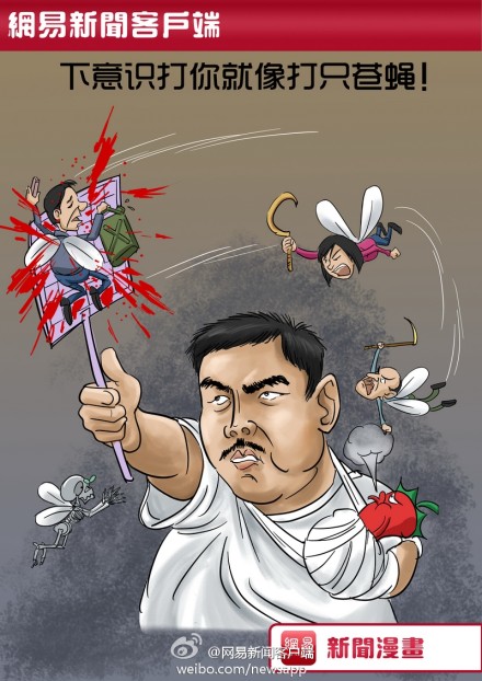“Subconsciously striking you is like swatting a fly!” exclaims the cartoon version of Liaoning police officer Zhang Yan. Zhang and a crew of construction workers battled a farming family at the scene of a forced demolition in the town of Panjin. One villager, Wang Shujie, allegedly set himself on fire and rushed at Zhang with a sickle. Zhang then says he “subconsciously fired his gun” six times, killing Wang. Cradled in Zhang’s broken arm, Rebel Pepper will have none of it.