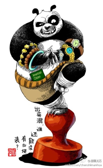 “Watch Brother” Yang Dacai lost his job after smiling at the scene of a horrific truck crash and brandishing multiple luxury watches. Consciously or not, he is now pulling other officials down with him. Sinking Stone imagines a sinister Kungfu Panda, ready to pounce from his perch atop a government stamp and then hightail it to the U.S. with his green card. “What goes around comes around,” reads the caption. “Who doesn’t own a few watches?”