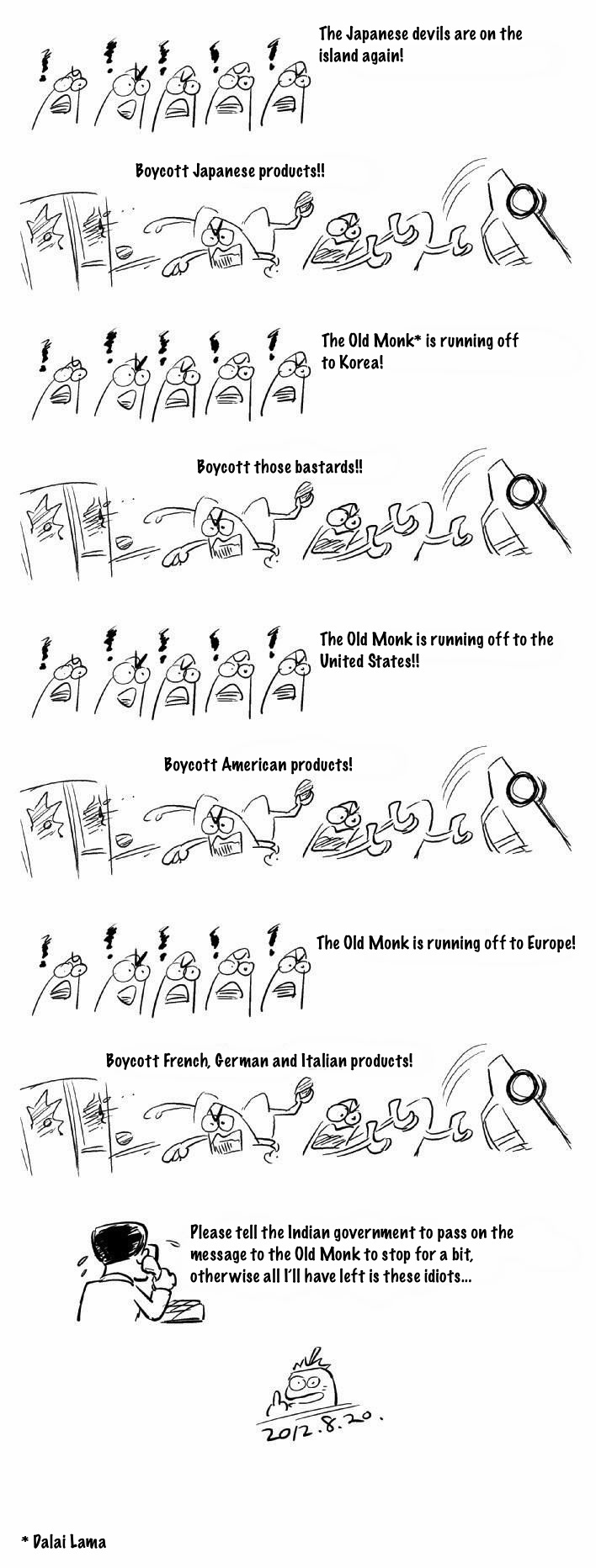 Rebel Pepper comments on the vigor of recent anti-Japan protests following Japan’s purchase of three of the Diaoyu Islands. He notes that the mob’s reaction to Japan mirrors perennial anger with the “Old Monk” (the Dalai Lama). When pro-Tibet demonstrations hounded Olympic torchbearers in 2008, Heilongjiang provincial websites were instructed to direct patriotic discussions at the “Dalai clique’s secessionist forces.”