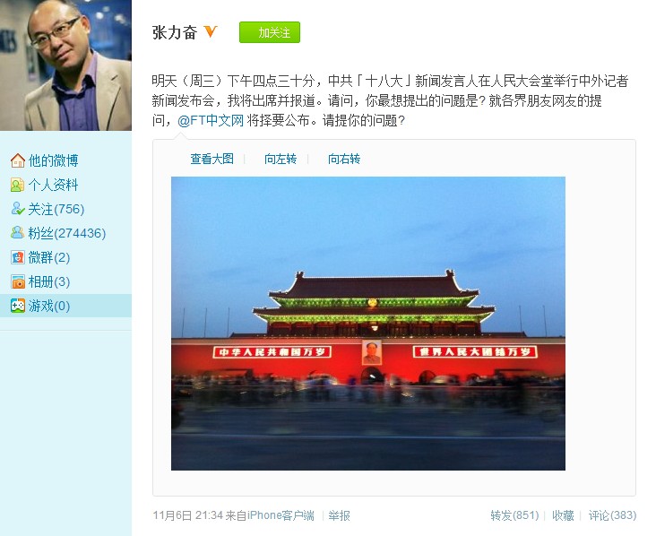 FT Chinese’s Zhang Lifen asks the Weibo public what they would like to ask the Party Congress representatives.