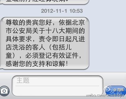 FanWei: [Urgent Notice: ID Now Needed in Imperial Capital Bathhouses–Children Included!] Greetings, esteemed patron. According to Beijing Public Security Bureau directives regarding the [18th Party Congress], all bathhouse patrons (including children) must present valid ID when checking in. Thank you for your support and understanding!