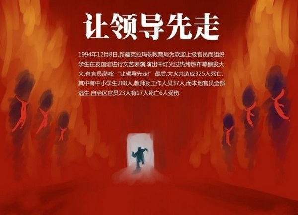 Rebel Pepper commemorates the Karamay Fire, which took the lives of hundreds of schoolchildren in 1994 and etched the chilling mantra “leaders first” into the Chinese language. The tragedy is invoked to describe the suffering of ordinary people as they are sacrificed for the authorities. A lone figure runs out of a burning building, while children wearing their red Young Pioneers scarves, flames rising out of their bodies like the halos of bodhisattvas, line either side of the walls. The text in the image reads, “On December 8, 1994, the education bureau of Karamay, Xinjiang held a talent show in Friendship Theater to welcome visiting officials. During the performance, a light overheated, setting fire to the stage curtain. A conflagration raged. A leader shouted, “Leaders first!” In the end, 325 people died, including 288 schoolchildren and 37 teachers and workers. All of the local leaders escaped with their lives. Of 23 provincial-level officials [present], 17 died and six were injured.”