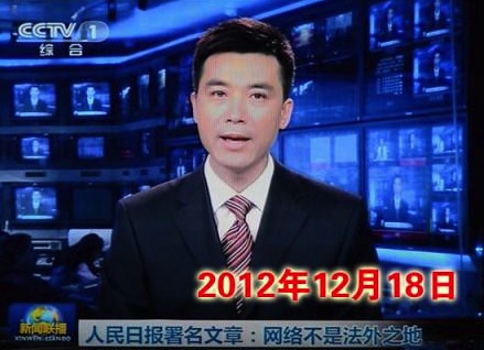 CCTV reported on the People’s Daily article “The Internet is Not Outside the Law” on its prime-time news show.