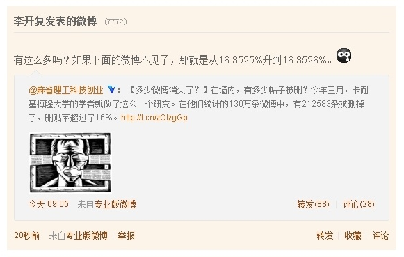 @李开复:有这么多吗?如果下面的微博不见了,那就是从16.3525%升到16.3526%。// @麻雀理工科技创业:【多少微博消失了?】在墙内,有多少帖子被删?今年三月,卡耐基梅隆大学的学者就做了这么一个研究。在他们统计的130万条微博中,有212583条微博被删掉了,删贴率超过16%。
