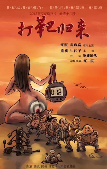 (Dashix @大尸凶的漫画) If Xi is serious about fighting corruption, he has a long way to go. Zhao Hongxia, the woman who taped her sex session with Lei Zhengfu to blackmail him, slept with five other Chongqing officials, identifying herself with her real name and two other fake identities. (The stopwatch indicates Lei’s “stamina” in the video.) Read more about how she hit her target from the International Business Times [zh].