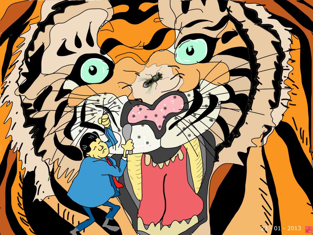 (Sinking Stone @漫画沉石)Last week, Xi Jinping vowed that the Party “must uphold the fighting of tigers and flies at the same time,” that corruption should be investigated among officials both high and low. This tiger, who has the mark of the “king” (王) on his forehead, thinks he can make off with a fortune. Distracted by the fly swatter, he doesn’t see what’s about to hit him. In a corruption crackdown, lower-level officials may find themselves out of work; but the big players, like Bo Xilai, have far more to lose.
