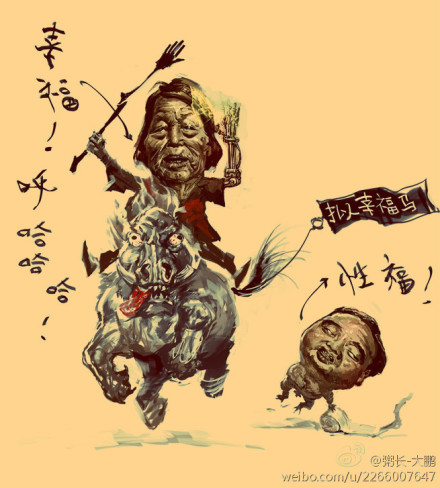 - Senior NPC delegate Shen Jilan thunders towards Zhongnanhai on her “fake happy horse” (拟幸福马 nǐ xìngfú mǎ), so named to play off the notorious CCTV interview question (reported here by Tea Leaf Nation), “Are you happy?” (你幸福吗 Nǐ xìngfú ma). A torch in one hand and a vote-yes aide in the other, she chortles, “Happiness! Hoo ha ha!” A toad-like Lei Zhengfu hops alongside the horse–he is “sex-happy” (性福 xìng fú). A leaked sex tape cost Lei his government job late last year. (Zhou Zhang-Roc)