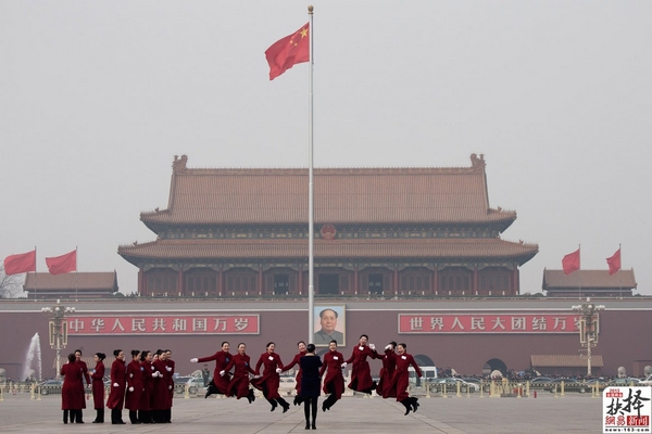 - March 8, hostesses jump for a group photo in Tiananmen Square. (NetEase)