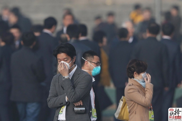- March 8, Japanese journalists protect themselves from the smog outside the Great Hall of the People. (NetEase)
