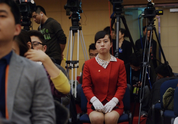- March 9, a hostess sits at attention during a press conference at the Media Center in Haidian, Beijing.