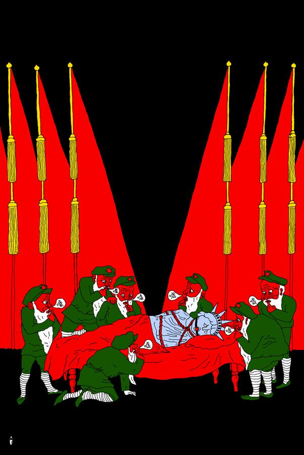 - A directive leaked on Weibo last week which orders universities to forbid seven topics from classroom discussion: “freedom of the press, a civil society, civic rights, historical mistakes committed by the Communist Party, elite cronyism, and an independent judiciary” (translated by South China Morning Post). Here, Lady Liberty is shushed by seven elderly captors, representing the seven members of the Politburo Standing Committee. (Badiucao)