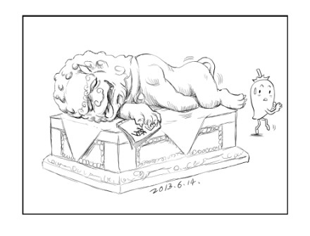 - City management officials, or chengguan, are a para-police force known for their brutality. On May 31, a group of chengguan accosted Liu Guofeng, the owner of a bike shop in Yenan, Shaanxi Province. Liu was dragged to the ground, while one officer jumped on his head. The online video of the assault enraged netizens, but an open letter issued on Baidu Tieba on June 7 made matters worse. The letter, written with the “consent” of Liu, claimed that Liu accepted that he had some responsibility for the incident. “Netizens, do not let this particular incident erase the image of this sacred site of revolution.” The Chinese Communist Party operated from Yenan between 1936 and 1948. All of the city, save for a pagoda, was destroyed during World War II. In Kuang Biao’s cartoon, that pagoda hammers home an impression of this “sacred” city. (Kuang Biao)