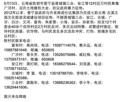 - Despite objections from more than 20,000 villagers and 12 village committees from Sanhe, Anjiang, Gucheng, Guangji, Baisha, Wenhe, Fuyou, Zhujiaying, Xiaohai, Anle, Sunjiaba, and Huilong, the local government of Jinning County and members of the Northstar Group (诺仕达集团) have been seizing land since 2012 to build the Radiant Yunnan Gudian Kingdom cultural tourism site. SWAT teams and armed police were deployed to the villages on multiple occasions to destroy property and crops. A number of bloody clashes occurred between the villagers and the police, resulting in the assault and arrest of several protestors.