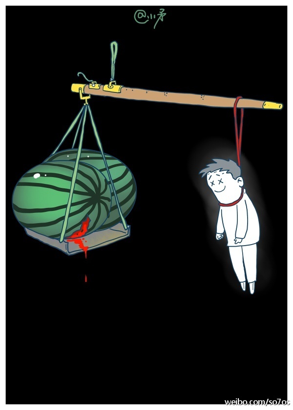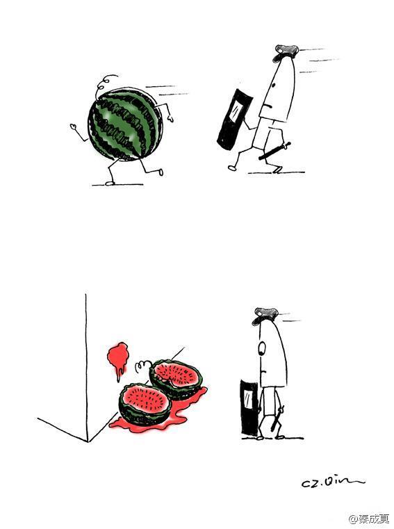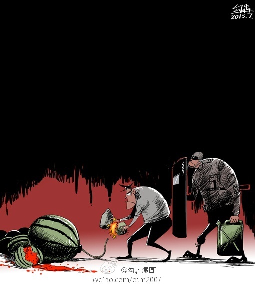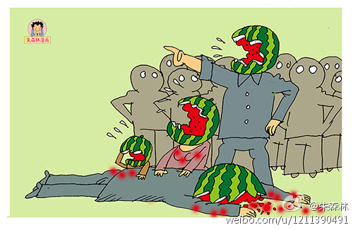- Cartoonist Tantou Jieren wrote a poem to accompany his illustration, titled “Do You Know Why I’m Angry?”: Are the people your enemies? / Are the people your watermelons? / Aren’t you human? / Let me tell you / You have no idea what seed you’ve planted (《你知道我为什么愤怒么?》 人民是你们的敌人么 人民是你们的西瓜么 你们不是人生的么 那告诉我 你们哪一种动物杂交出来的) (Tantou Jieren)