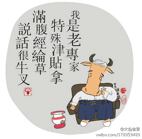我是老专家,特殊津贴拿。满腹经纶草,说话很牛叉。