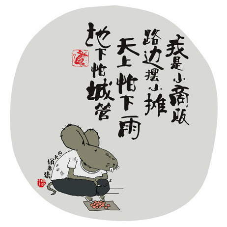 我是小商贩,路边摆小摊。天上怕下雨,地上怕城管。