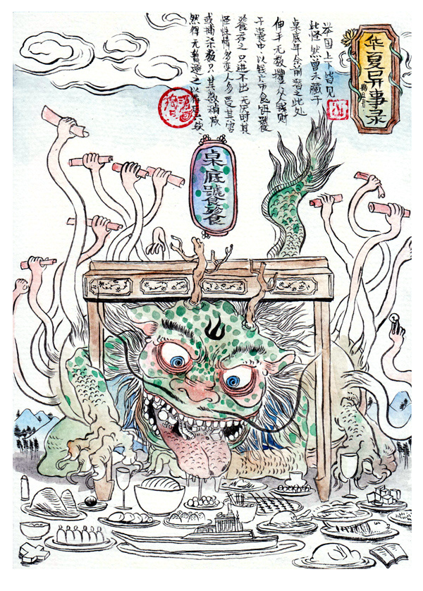 【桌底饕餮】举国上下皆见此怪,然曾未藏于桌底。年余前潜之此处,伸手无数,攫人钱财于囊中。以钱广市食饵,饕餮吞之,只进不出,无厌时。其怪性情多变,人多受其害。或捕杀数只,其数稍减,然得无暂避之以待后兴欤?