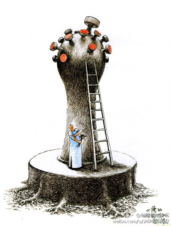 Artist Kuang Biao does not have much hope for real reform. Here, he shows a man in a traditional changshan pulling up his sleeves to cut down corruption. But the man will only be taking down the official stamps that have sprouted from the giant stamp on which he stands, and which has put down roots. The cartoon implies that without changing the political system itself, there can only be cosmetic reform. (Kuang Biao)