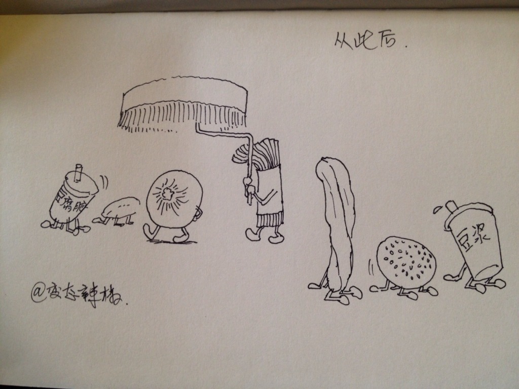 Soy milk, rolls, and even a long cruller (youtiao) bow down before the mighty baozi. (Cartoon by Rebel Pepper)
